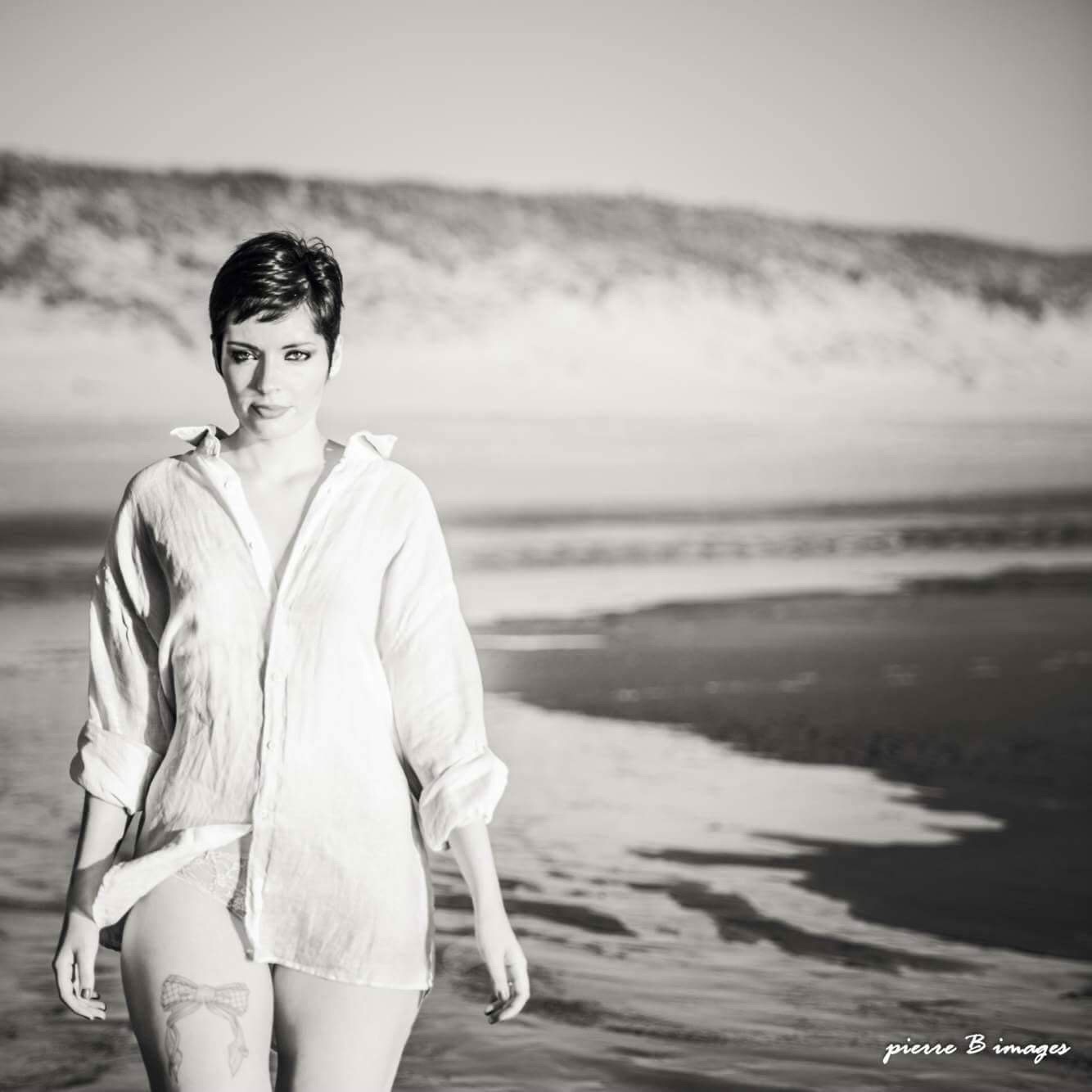 J’étais arrivée à ma première séance très intimidé. Malgré ma grande taille, je suis une fille en retrait qui ne souhaite pas se faire remarquer. La séance se déroulait à la plage avec une chemise d’homme transparente. Un thème que j’avais choisit. Je me souviens avoir adoré mon photographe mais j’étais très mal à l’aise. Je ne me laissé pas aller.